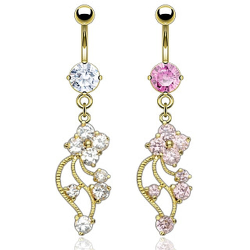 Wunderschönes Bauchnabel Piercing vergoldet (PVD) beschichtet mit Kristall Stein und Kristall Blume.