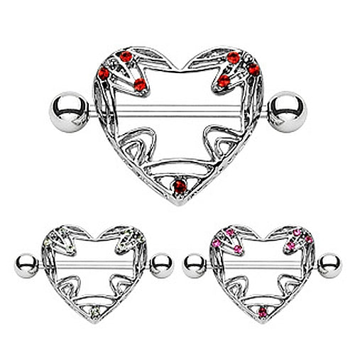 Dieses Herz Brustwarzenpiercing besteht aus Chirurgenstahl und ist mit kleinen Strass Steinchen verziert. Der Barbell Piercingstab hat eine Stärke von 1,6mm und ist 19mm lang. Die 5mm großen Verschlußkugeln lassen sich abschrauben. Das Herz ist 20x20mm groß und mit jeweils 7 kleinen Strass Steinchen besetzt. Dieses Brust Piercing ist in verschiedenen Strass Farben verfügbar.