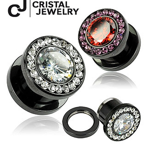 Flesh Tunnel aus beschichtetem Titan PVD (Oberste Schicht ist aus Titan der Kern aus Chirurgenstahl) im Black-Style mit weißen Strass und Kristallstein. Der Tunnel kann aufgeschraubt werden und ist in verschiedenen Größen verfügbar.