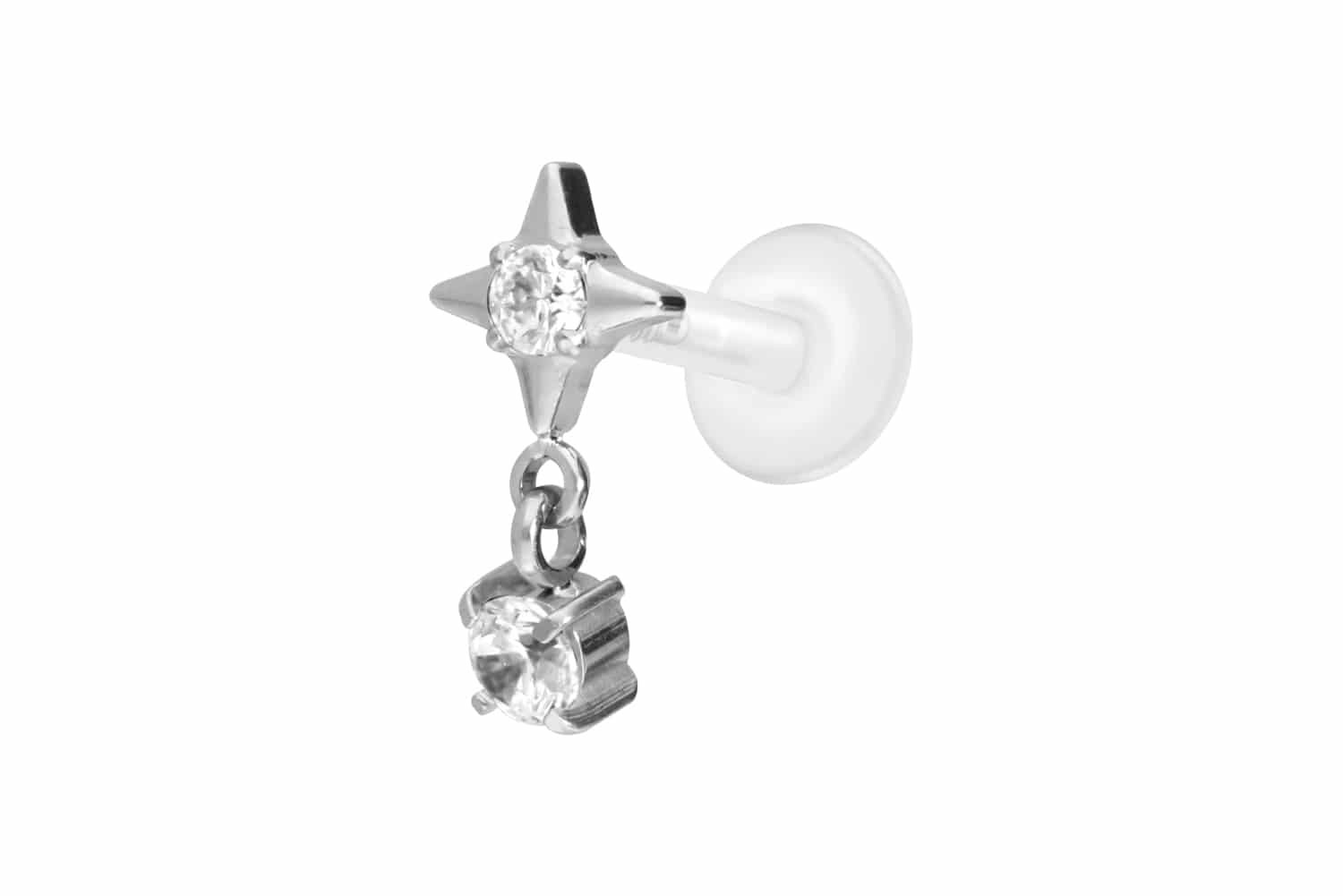 PTFE LabretPTFE – Labret mit Innengewinde + Titan-Aufsatz Stern + Kristall Dieses einzigartige Labret ist aus hochwertigem PTFE gefertigt, das ebenfalls unter dem Handelsnamen Teflon bekannt ist. Nur der Schraubaufsatz mit Außengewinde in Form eines Sterns, an welchem ein funkelnder Kristall befestigt ist, wurde anstelle dessen aus Titan gefertigt. Beide Materialien verfügen neben ihrer exzellenten Qualität auch über weitere nützliche Eigenschaften wie etwa besonders gute Hautveträglichkeit und Beständigkeit. PTFE betreffend kommen Flexibilität und Anpassungsfähigkeit hinzu. Letztere macht sich im Falle dieses Artikels dadurch bemerkbar, dass sich der Stab je nach Belieben mit einer gewöhnlichen Haushaltsschere kürzen lässt. Anschließend kann mithilfe des Aufsatzes ein neues Gewinde eingedreht werden, sodass weiterhin ein optimaler Halt gewährleistet wird. Zu den Vorzügen von Titan gehört Farbechtheit, die auch bei den farbigen Varianten mit PVD-Beschichtung gewährleistet wird. Das Labret hat eine Stabstärke von entweder 1,2 oder 1,6 mm und ist in den unten aufgeführten Stablängen erhältlich. Darüber hinaus kann sein 0,9 mm Innengewinde nach Belieben mit all unseren anderen Schraubaufsätzen mit entsprechendem Außengewinde kombiniert werden. Material: PTFE / Titan (Grad 23)Oberfläche: glatt / hochglanzpoliert / PVD-BeschichtungMaterialfarbe: goldfarben / roségoldfarben / schwarz / silberfarben / transparent Kristallfarbe: kristallklarStabstärke: 1,2 / 1,6 mmStablänge (bei 1,2 mm Stabstärke): 5 / 6 / 7 / 8 / 9 / 10 mmStablänge (bei 1,6 mm Stabstärke): 6 / 7 / 8 / 10 mmGewinde: 0,9 mmDiscgröße (Stern + Kristall): 5 x 11,5 mm Dicke der Platte (bei 1,2 mm Stabstärke): 1,4 mm Dicke der Platte (bei 1,6 mm Stabstärke): 1,8 mm Durchmesser der Platte (bei 1,2 mm Stabstärke): 4 mm Durchmesser der Platte (bei 1,6 mm Stabstärke): 5 mm Alle Maße sind Zirka-Angaben